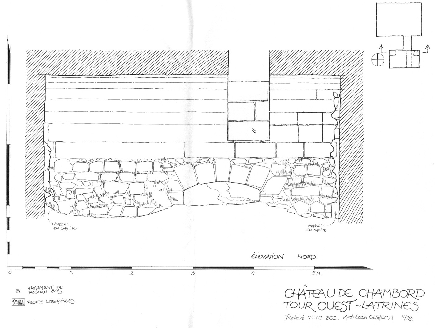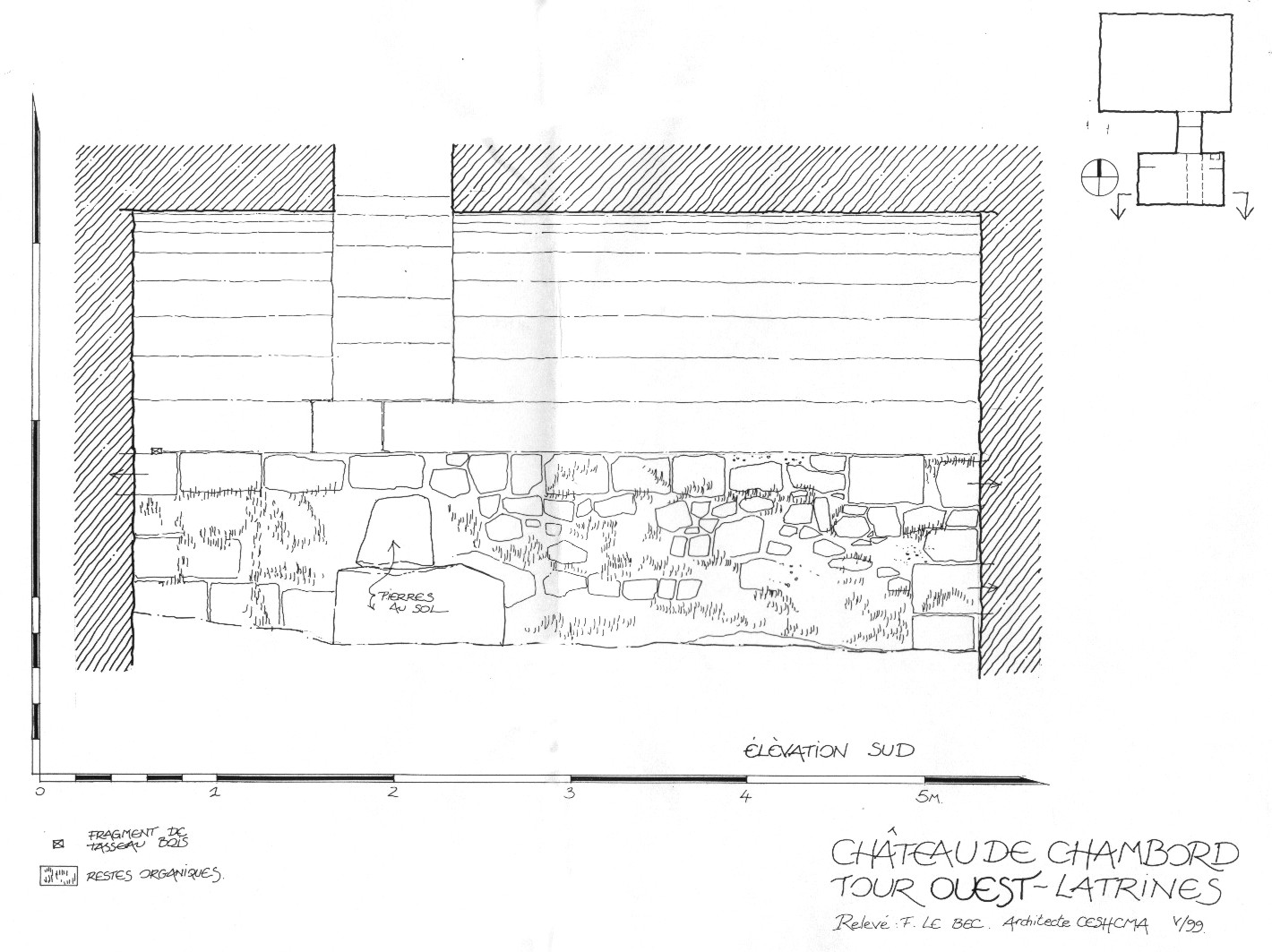 Relevé topographique des fosses de latrines dans le sous-sol du donjon, avec rétablissement de l'orientation réelle.